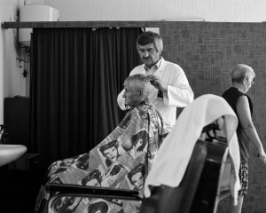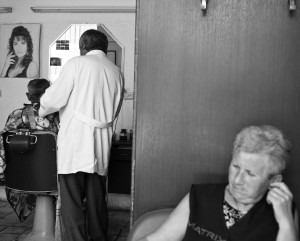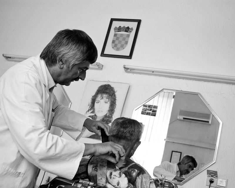 Ich treffe mich mit Snježana wieder nahe dem Bahnhof, und bin – sofern ich mich richtig erinnere – mit dem Taxi zurückgefahren. Denn in Osijek werden Taxifahrten pauschal mit 13 Kuna verrechnet, das entspricht ungefähr 2 EUROirgendwas. Zum Glück hat mir das während der OE Tage niemand von den dutzenden Ortskundigen erzählt, sonst wäre ich womöglich noch mit dem Taxi die 50 Meter vom Hotel Osijek rüber zum Trica gefahren. (Anm.: das wäre ich natürlich nicht, ich will nur dezent kritisch hinterfragen, warum niemand mit solch vitalen Informationen herausrückt, man stattdessen aber herumeiert, wie man wohl vom Kino zum Tufna und vor allem wieder unbeschadet nachhause kommt!) Wie dem auch sei, Snježana und ich stellen fest, dass man an einem Tag eben nur so viel machen kann und ich ausserdem ohnehin schon mehr als zufrieden bin. Aber sie möchte mir unbedingt noch den einzigen Herrenfriseur in Osijek zeigen bzw. vorstellen und auch ihn fragen, ob er sich im Laden von mir fotografieren lässt. Die Sache mit den offenen Türen erwähnte ich schon im letzten Beitrag, das Thema findet hier seine Fortsetzung, denn er und sein Kunde haben gar nichts dagegen. Allerdings ist letzterer neugierig darüber, was mich so sehr an den beiden interessiert dass ich sie fotografiere, worauf der Friseur antwortet, dass es sicher nicht ihrer beider Schönheit sein könne, denn wenn es mir um Schönheit ginge, müsste ich “das Mädchen” fotografieren. Das habe ich schon, und außerdem bin ich ziemlich sicher, dass auf diese Bilder besonders die Analogie mit dem guten Wein zutreffen wird. Vielleicht nicht so promiment, aber dennoch.