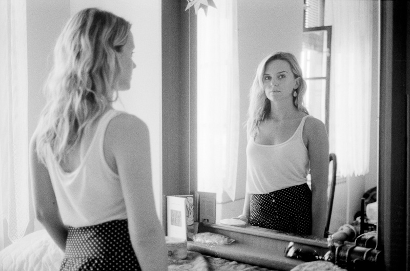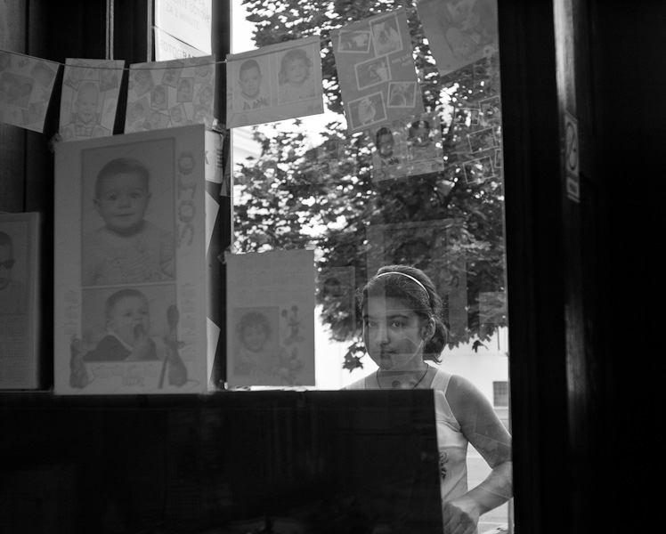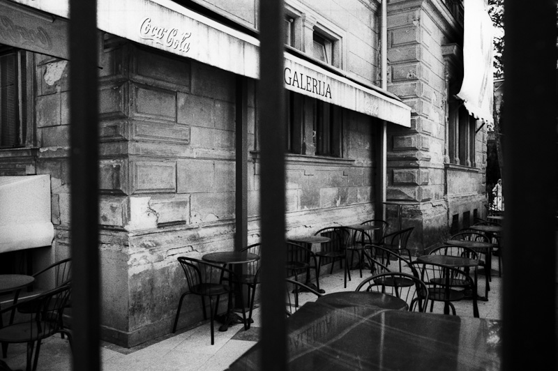 Da Snježana ihren Zug erreichen muss und der Chef vermutlich wegen des Rohrbruchs nicht zum Kassieren da ist, bleibe ich sitzen und warte. Beim Begleichen der Rechnung fällt mir dann auf, dass ich ziemlich transparent geworden sein muss, da ich nun ohne Begleitung bin. Denn so bemüht, wenn nicht schon aufdringlich der Wirt war, uns vom Rohrbruch und anderem zu erzählen, so bemüht ist er jetzt mich möglichst nicht zu sehen. Apropos durchsichtig: bevor ich überhaupt neue Wege beschreiten oder um die nächste Ecke schauen kann, muss ich den Film aus meiner CLE nehmen lassen, der beim Zurückspulen im Artelier stecken geblieben ist – aus welchem Grund auch immer. Diesem Mißgeschick verdanken wir, dass es nur ein Foto von Snježana gibt, und deswegen sind einige Fotos von Budimir und Tihomir sowie alle vom Friseur digital aufgenommen. Zum Glück hatte ich die RD-1 als Ersatzkamera im Gepäck, eine der besten Digitalkameras, die man – leider nur noch gebraucht – kaufen kann, die das M(esssucher)-feeling auch digital ermöglicht. Also gehe ich in einen Fotoladen in der Nähe und versuche dort auf Englisch meine Misere zu erklären. Der Mann im Laden ist äußerst nett und hilfsbereit, er nimmt den Film in der Dunkelkammer aus der Kamera und gibt ihn mir in einem opaken Filmkanister. Ich bekomme allerdings zum zweiten mal weiche Knie (das erste mal durch die Feststellung, dass der Film hängen geblieben war) als ich einen zweiten Kanister bekomme und frage, was sich in diesem befinde, worauf er mir erklärt, dass er den Film ganz links abgeschnitten hat, damit auch kein Frame verloren gehe. Ich habe es also nicht geschafft klar zu machen, dass der ganze Film belichtet und schon teilweise zurückgespult ist. Nun ahne ich schon dass es entweder von den Künstlern oder von Snježana nicht viele Bilder geben wird. Einzig die Schnappschüsse am Filmanfang sind in Sicherheit, aber das ist Murphy’s Law in Aktion.